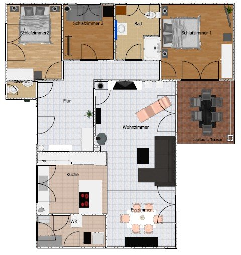 Der Grundriss bietet Ihnen einen sehr hellen und großzügigen Eingangsbereich, von dem Sie alle Zimmer im Erdgeschoss erreichen. Der große Wohn- & Essbereich lädt zum Verweilen vor dem Kamin ein. Die moderne und voll ausgestattete Einbauküche inklusive Dampfgarer bietet ausreichend Platz zum gemeinsamen Kochen. Eine Waschmaschine und ein Trockner sowie Bügelbrett - und Bügeleisen stehen im Hauswirtschaftsraum zur Verfügung.